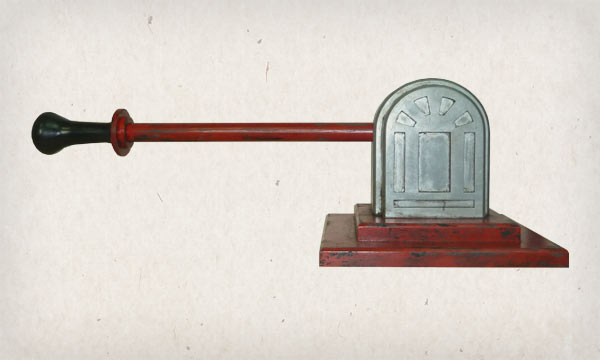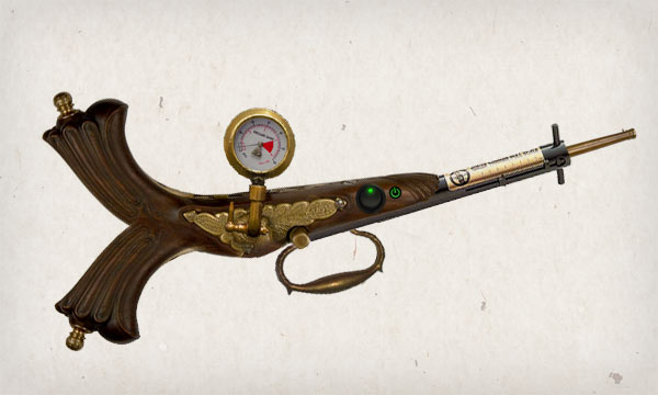 Fashioned after the design of my Grandpop’s signaling levers but crafted so only one with superhuman strength can wield it, with a yank I can send the deserving to fine hotels rooms anywhere. It may seem magical to the man on the street, but it is the awesome power of Science. I stumbled upon Nikola Tesla’s schematics and notes on a theoretical ‘teleforce’ weapon when in Belgrade. With a little tweaking of the magnifying transformer, I was able to turn this monstrous weapon to more peaceful ends. The base of the lever houses a small open-ended vacuum seal with a gas jet seal that – well, I’ve said too much already!
